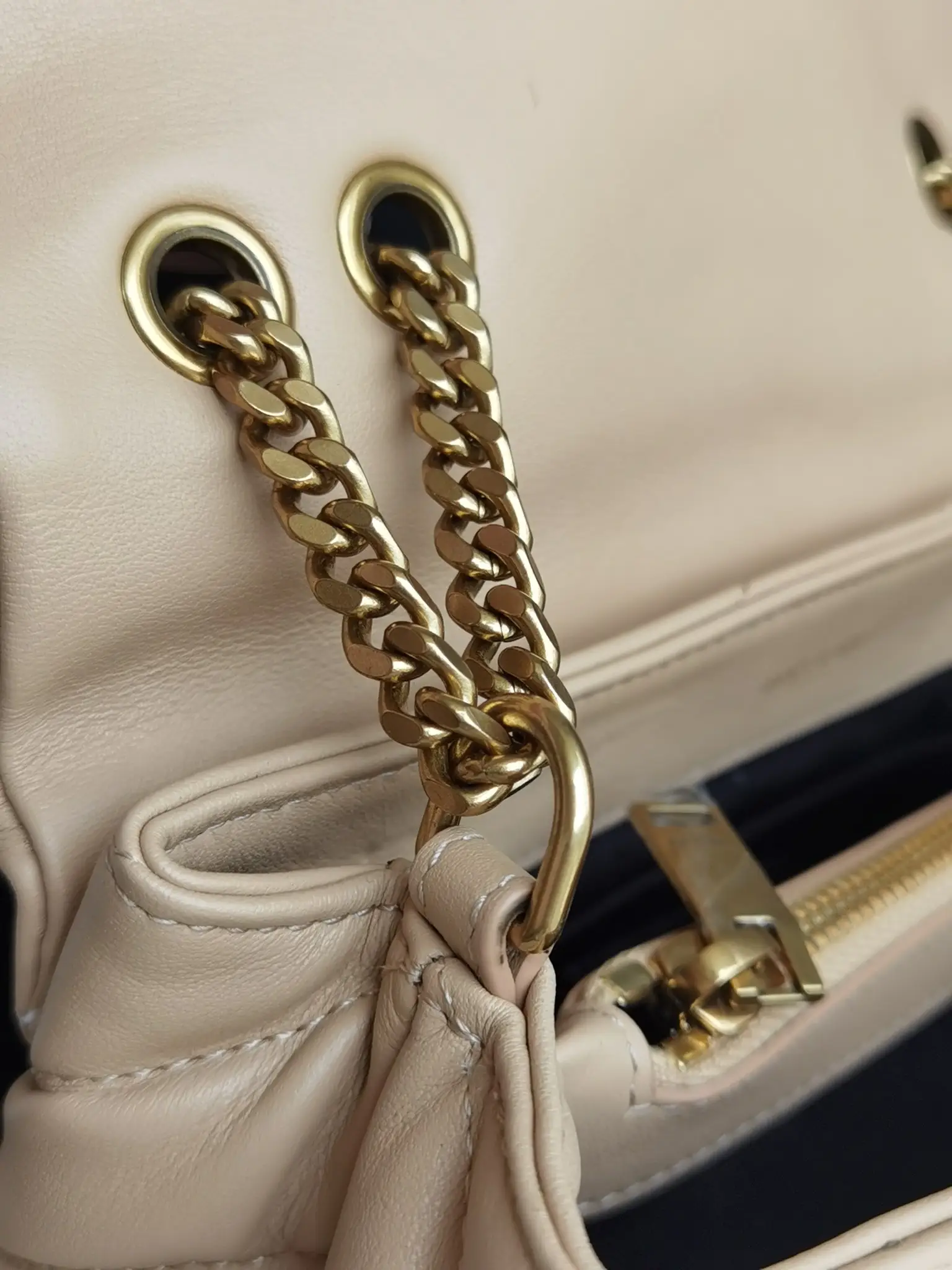 Factory calf leather, paired with gold hardware, satin lining, magnetic lock classic pattern and “Y” – shaped splicing and stitching, making it exquisite for both ears and eyes. The casual and fashionable combination shows high-end atmosphere. The shoulder strap can be combined with two shoulder straps, or slung over the shoulder. Size: 25 * 17 * 9CM milk tea gold buckle 18780